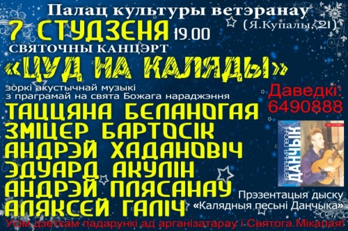 У фае канцэртовае залы можна будзе таксама паглядзець поўную дыскаграфію ўсіх гэтых артыстаў, а нешта й набыць на памяць аб цудоўным свяце. А ўсім дзеткам арганізатары абяцаюць падарункі ад Святога Мікалая, заўсёднага патрона Калядаў! Канцэрт адбудзецца, нагадваем, 7 студзеня ў мінскім Палацы культуры ветэранаў (вул. Я.Купалы, 21) у 19.00. Даведкі па тэл. 649 08 88.