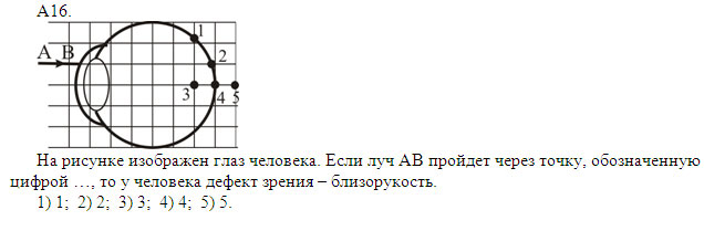 Давайце задачу А16 паглядзім. На малюнку чалавечае вока, намаляваны прамень святла, і трэба вызначыць, які ў чалавека дэфект зроку. У школьнай праграме гэтая тэма ёсць, а ў праграме ўступных іспытаў пералічана некалькі тыпаў лінзаў, але пра вока ― ні слова!