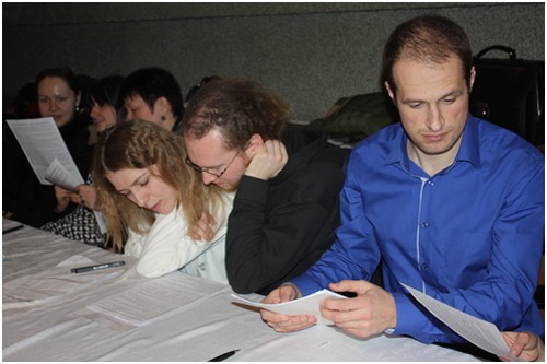 Спаборнікі здалі працы і атрымалі аркушы з адказамі. Дужа цікава. У сінім – Юрась Каласоўскі