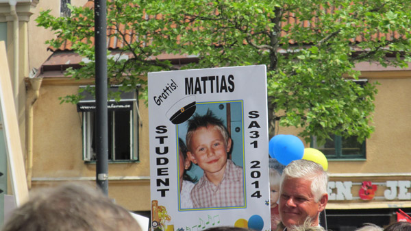 А незадоўга да гэтага на гарадской плошчы мы таксама назіралі не менш дзіўную для нас карціну. Уся яна была запоўнена людзьмі, якія трымалі над галавой транспаранты. Здалёк падалося, што ў горадзе праходзіць нейкі мітынг. Але наблізіўшыся, мы здагадаліся, што гэта бацькі, у руках якіх… вельмі кранальныя фатаграфіі маленькіх дзяцей, якія ўжо выраслі і сёлета скончылі школу. У многіх былі букеты з жоўтых і блакітных хрызантэм (гэта колеры нацыянальнага флага Швецыі). Як высветлілася, мы трапілі на ўрачыстую частку выпускнога. Слёзы радасці, жарты, смех, малодшыя браты і сёстры ў «групе падтрымкі», выпускнікі на сцэне — усё было як у нас, але адначасова і зусім па-іншаму…