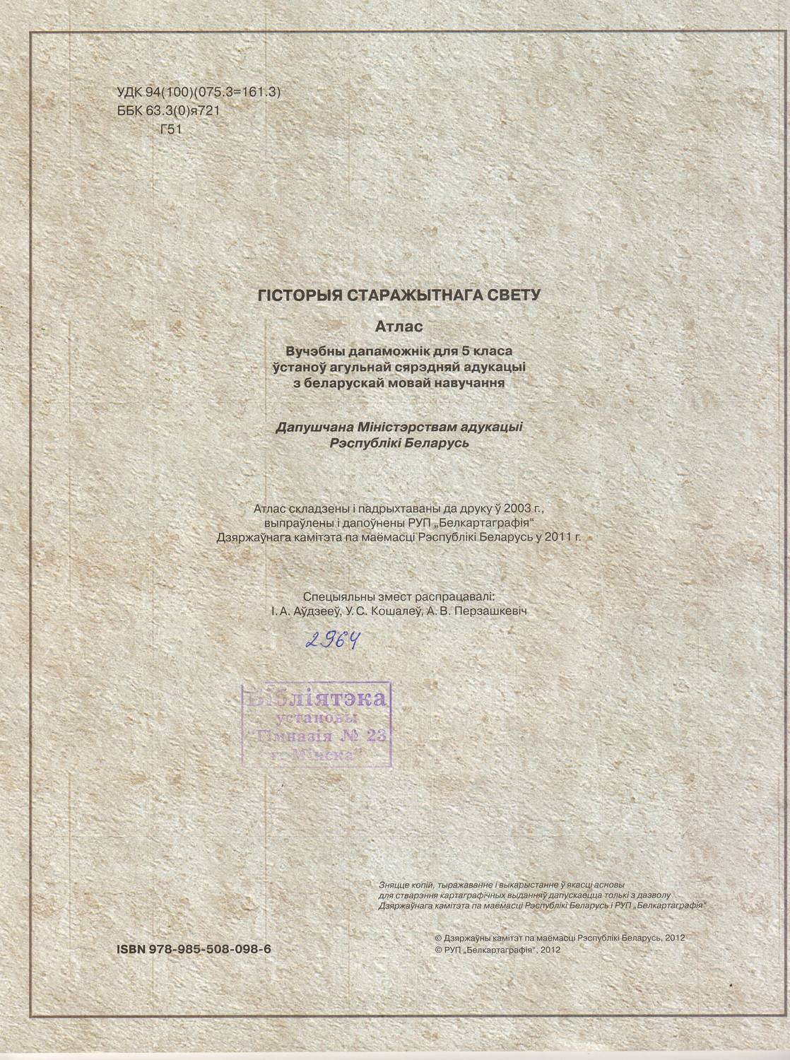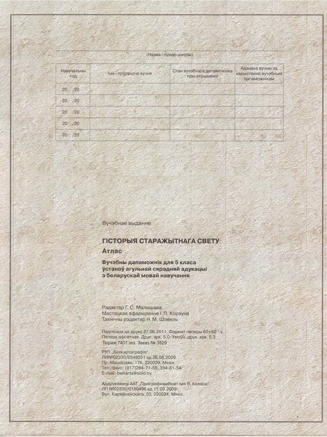 ГісторыяПадручнікіГісторыя Старажытнага свету: Атлас: Вучэбны дапаможнік для 5-га класа ўстаноў агульнай сярэдняй адукацыі з беларускай мовай навучання. Мінск: Белкартаграфія, 2011.